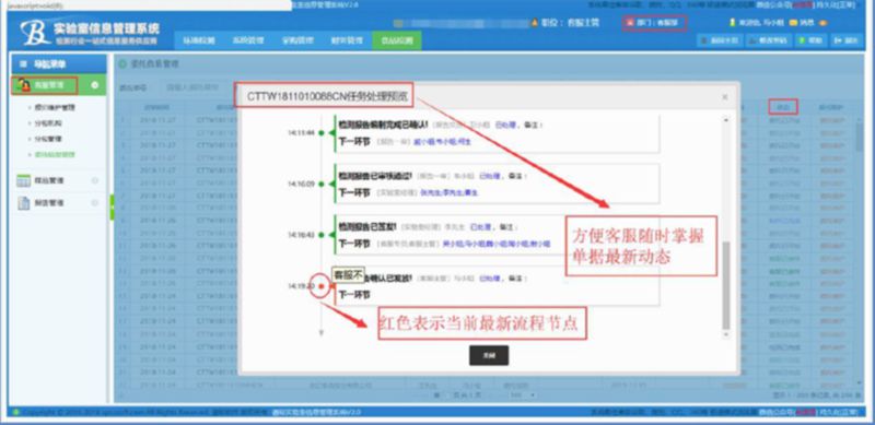 方便客服隨時掌握單據最新動態,委托信息管理流程如下:報告編制完成確認 -> 測報告已簽發 -> 檢測報告確認發放.