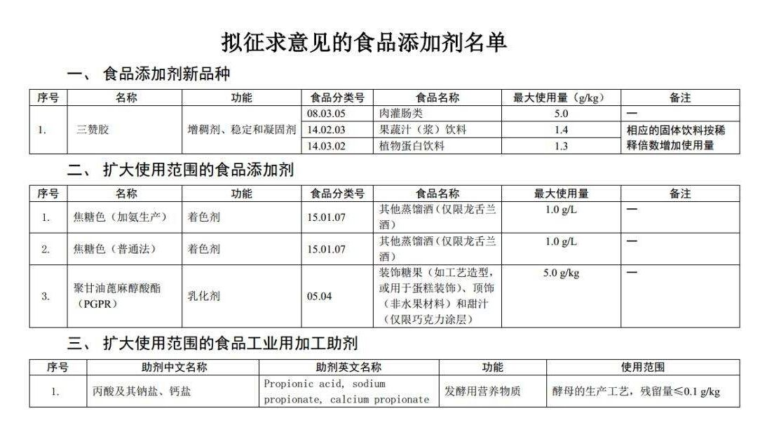另外,還有4種食品添加劑新品種也在本次公開征求意見。其中,擴大使用范圍的食品添加劑為:焦糖色(加氨生產)、焦糖色(普通法)、聚甘油蓖麻醇酸酯(PGPR);擴大使用范圍的食品工業用加工助劑為:丙酸及其鈉鹽、鈣鹽。